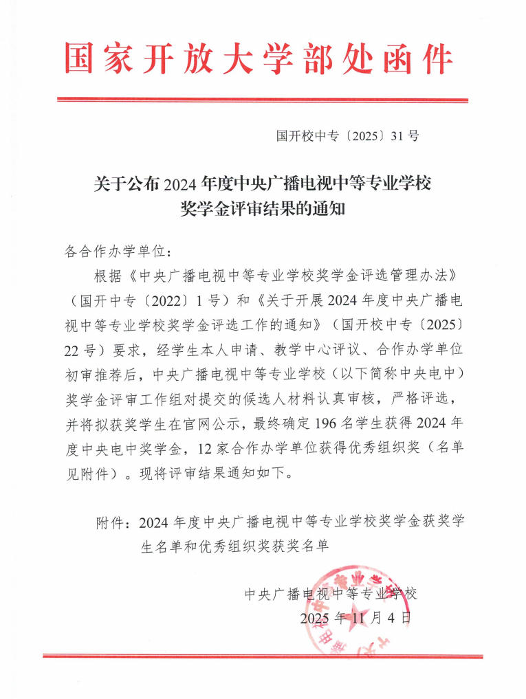关于公布2024年度中央广播电视中等专业学校奖学金评审结果的通知
